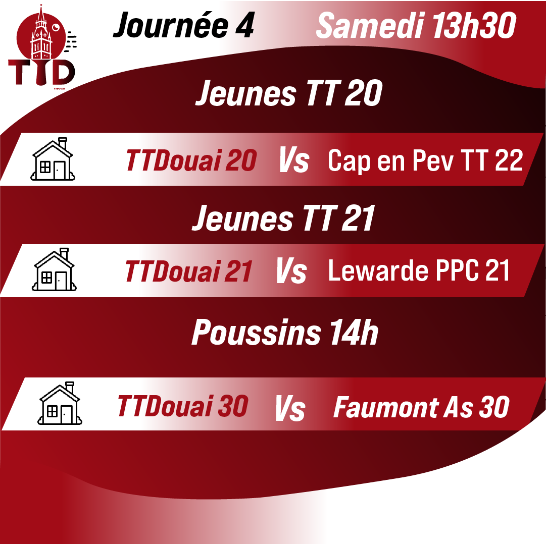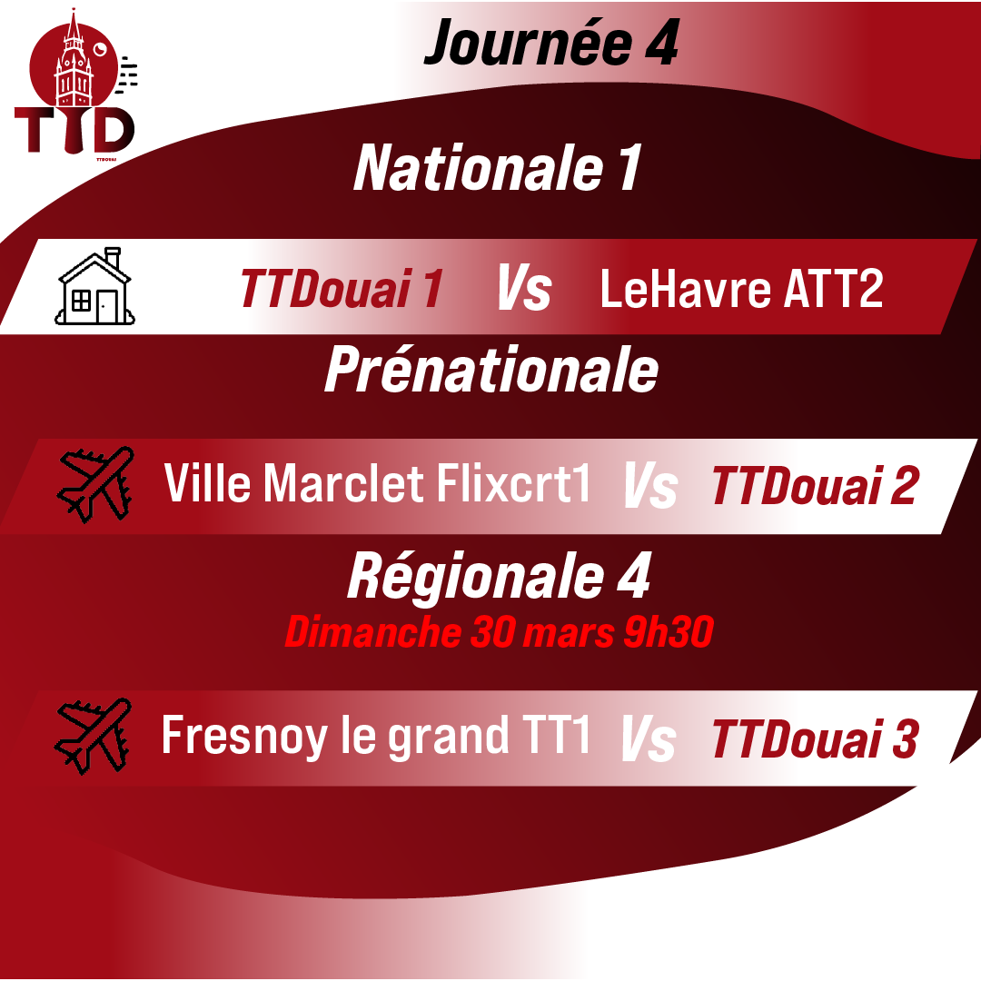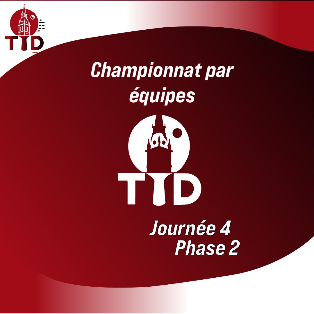 Création de visuels pour annoncer la 4ᵉ journée du championnat par équipe, avec un design utilisant les couleurs du club et une mise en page inversée pour indiquer que l’équipe 1 joue à domicile.
